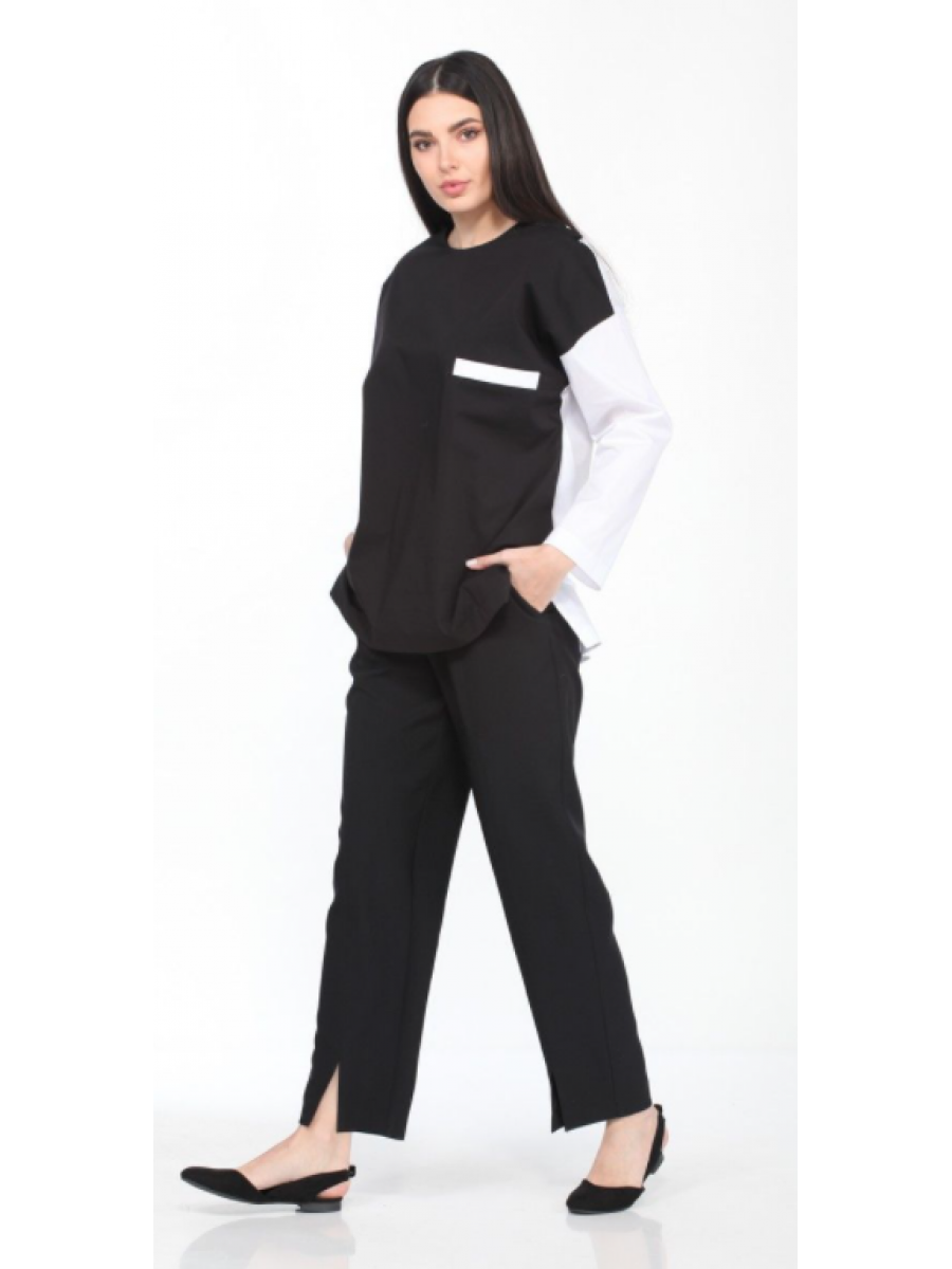 Оформить заказ →Костюм, состоящий из рубашки и брюк. Рубашка свободного силуэта со спущенными рукавами, выполненная из черного и белого поплина; по переду декоративная листочка, по спинке застежка-планка на петли и пуговицы. Брюки прямого силуэта с разрезами и декоративными отстрочками по передним половинкам брюк, карманы в боковых швах, отрезной пояс обработан эластичной тесьмой.