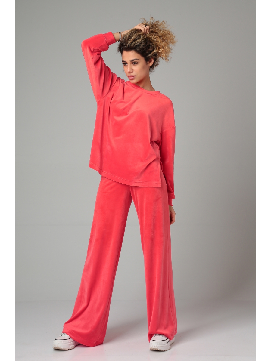 Стильный, мягкий, комфортный костюм из тонкого плюшевого вельвета. Блузон свободного силуэта, рукав втачной на спущенной пройме с манжетой, по бокам разрезы. Брюки свободного силуэта на эластичной ленте.