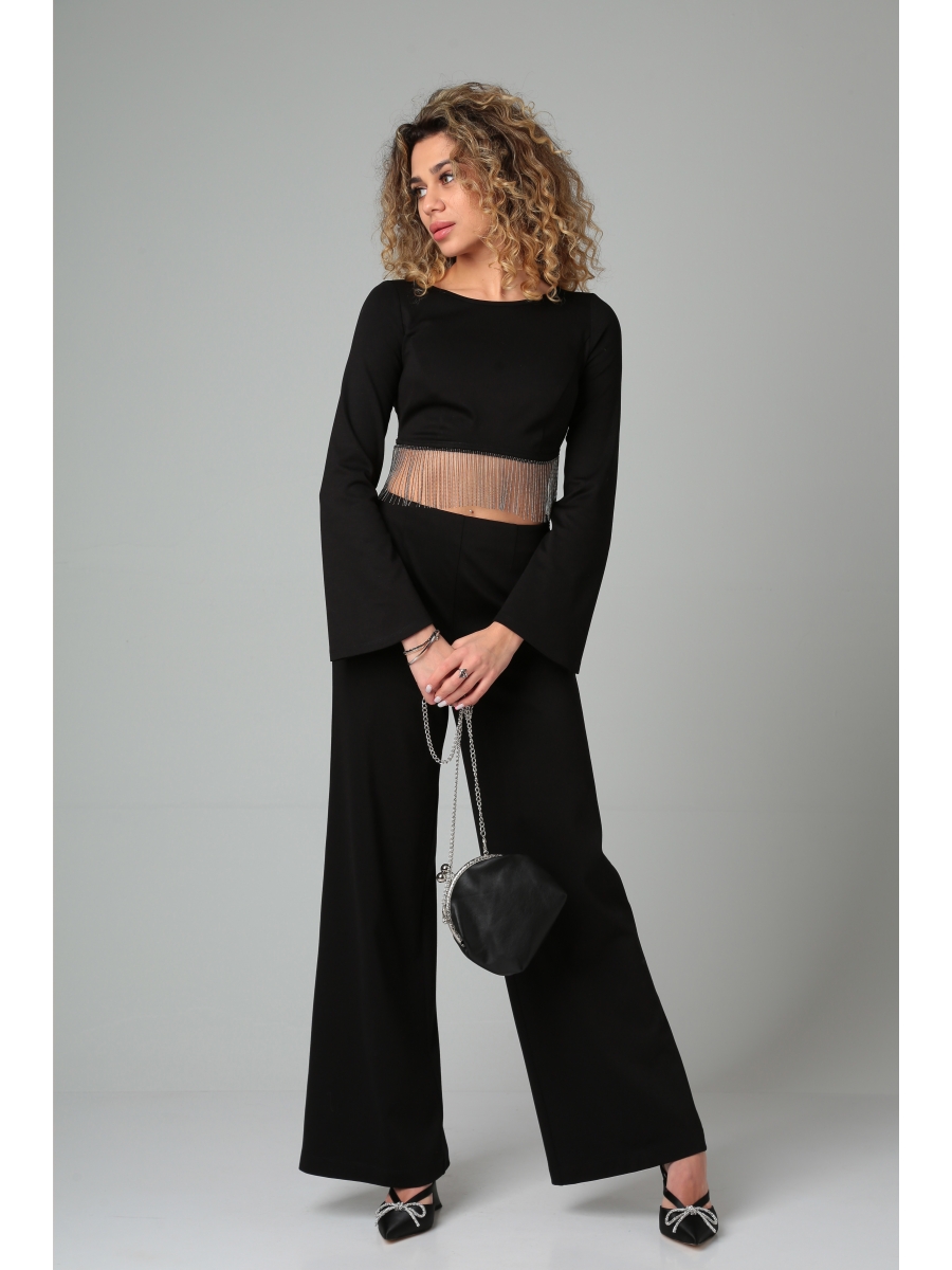 Очаровательный, эффектный, комплект 2-ка из высококачественной трикотажной ткани. Укороченный Топ украшеный тесьмой "каскад ", вырез горловины лодочка. Рукав втачной, расширен к низу. В боковом шве потайная молния. Брюки на завышеной талии, рсширены от линии бедра, пояс на обтачке, застежка молния в боковом шве.