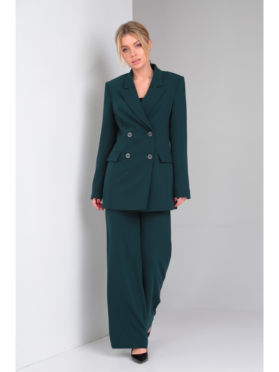 Двубортный пиджак приталенного силуэта с подрезом по линии талии, рукав втачной двухшовнный с декоративными петлями, карманы в рамку с клапаном. Застежка петли, пуговицы.