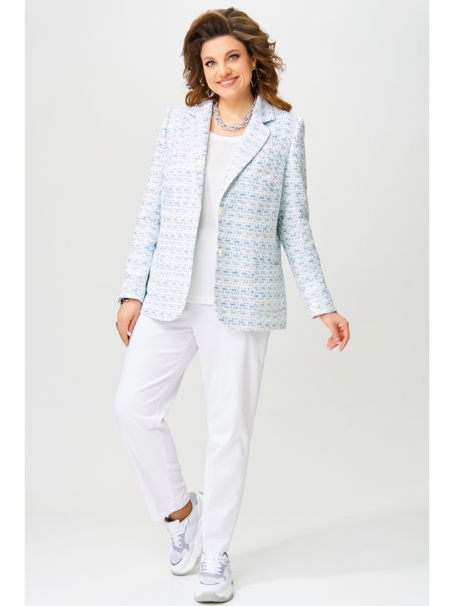 Жакет выполнен из хлопковой плотной ткани, рисунок в виде плетеной корзинки. Жакет на подкладке полуприлегающего силуэта, воротник отложной, по борту лацканы, низ борта закругленный, застежка однобортная на две пуговицы. По полочке - рельеф и накладной карман. По спинке - рельефы, рукав втачной двухшовный. Жакет нарядный отличный вариант для праздников и повседневной носки.