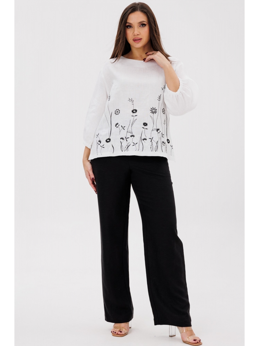 Блуза свободного силуэта. Горловина округлой формы, обработана обтачкой. Перед и спинка цельные. По переду выполнена декоративная дизайнерская вышивка. Рукав одношовный втачной, длиной 3/4. Низ рукава на резинке, линия плеча спущена. В боковых швах разрезы.