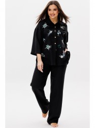 Рубашка свободного силуэта. Воротник отложной рубашечного типа. Застежка центральная на петли и пуговицы, спинка с кокеткой. На полочке расположены дизайнерские вышивки. Рукав 3/4 со спущенной линией плеча, одношовный.