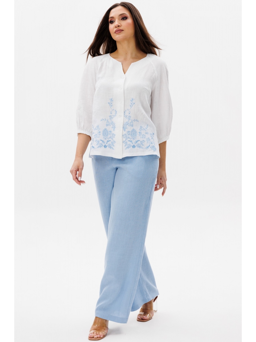 Рубашка свободного силуэта. Вырез горловины фигурный. Застежка центральная на петли и пуговицы, спинка цельная. На полочке расположены симметричные дизайнерские вышивки. Рукав реглан длиной 3/4, снизу собран на резинку. В боковых швах разрезы.