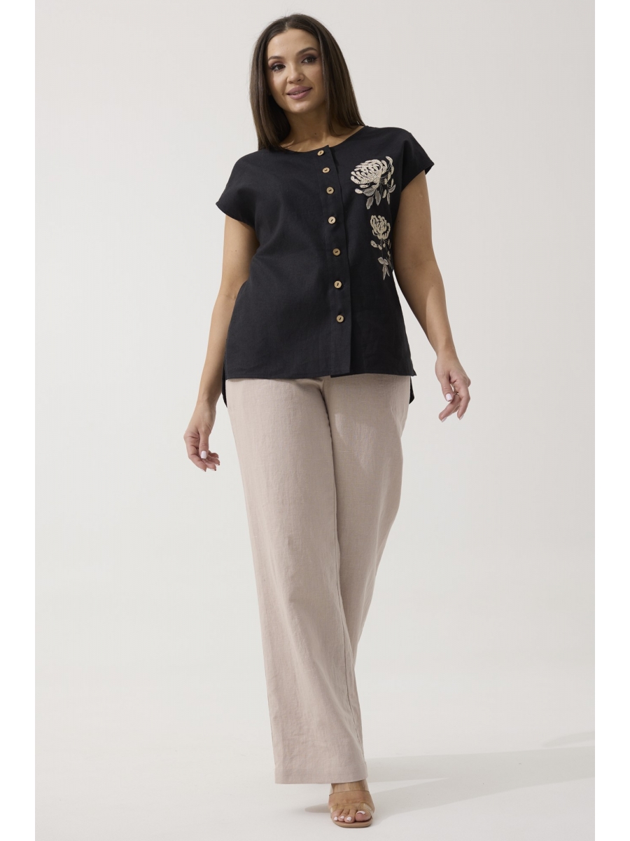 Блуза свободного силуэта. Вырез округлый. Застежка центральная на петли и пуговицы. По переду слева расположена дизайнерская вышивка ""хризантемы"". Спинка цельная, в боковых швах разрезы. Рукав короткий спущенный. Низ фигурный.
