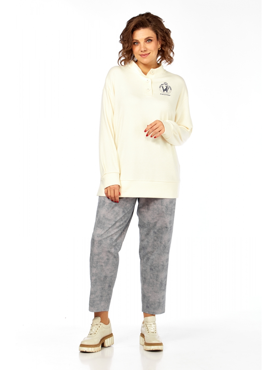Джемпер свободного кроя, изготовлен из трикотажного полотна. Горловина обработана воротником-стойкой и притачными планками с застежкой на петли и пуговицы. На полочке расположена вышивка. Рукава спущенные, по низу обработаны манжеты. По низу изделия притачная деталь с разрезами по бокам.
