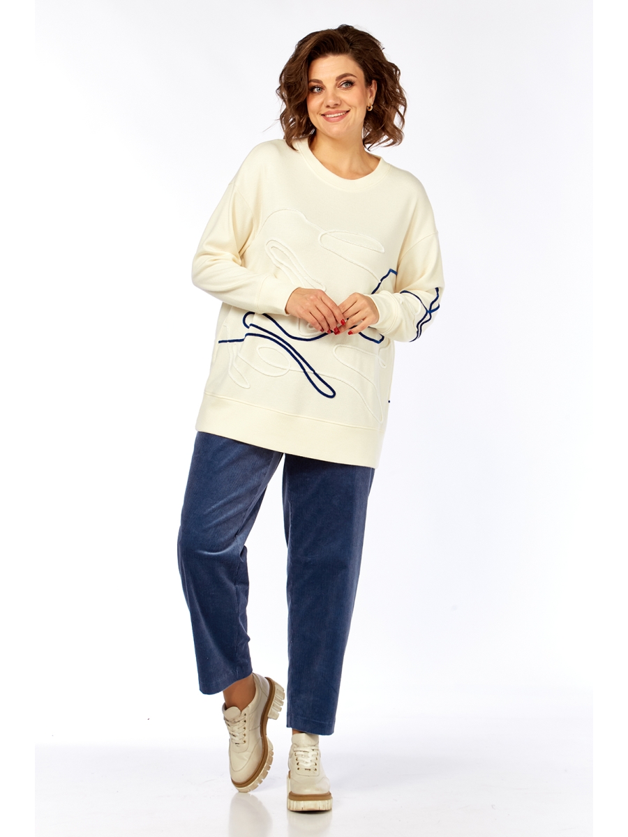 Джемпер свободного кроя изготовлен из трикотажного полотна. Горловина круглой формы. На полочке спинки и рукаве — вышивка шнуром. Рукава спущенные, с манжетами по низу.