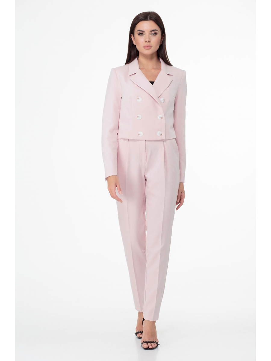 Жакет женский двубортный прилегающего силуэта, укороченный.Пиджачный воротник, талевые выточки, застежка на шесть пуговиц. Спинка с двумя рельефами и средним швом. Жакет с подкладкой. Рукава вточные двухшовные.