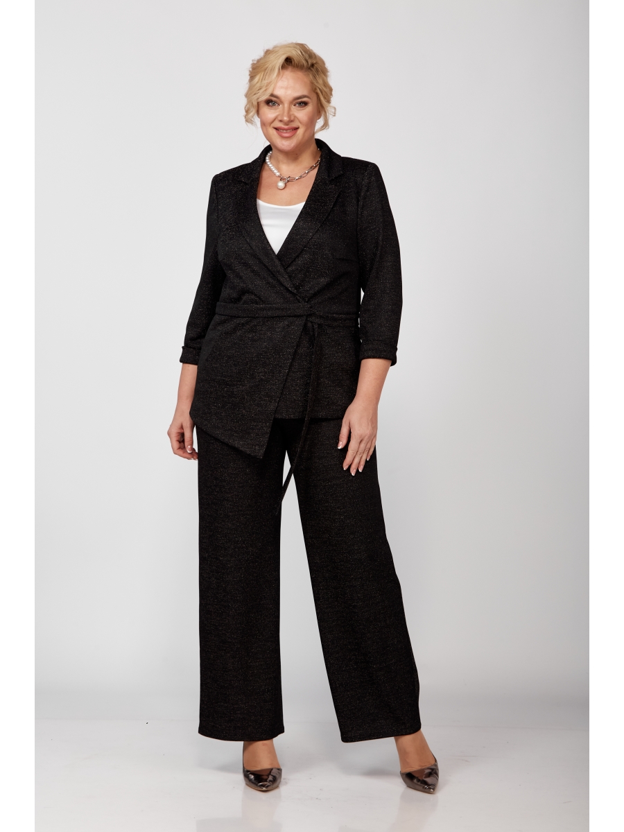 Жакет со съёмным поясом, прямого силуэта. Полочки с нагрудными вытачками, отрезные по линии талии. Низ полочек ассиметричный. Спинка со средним швом. Рукав втачной, длиной 7/8, по низу обработан манжетой. Застёжка двубортная на две петли и пуговицы. Горловина оформлена отрезными лацканами и воротником.