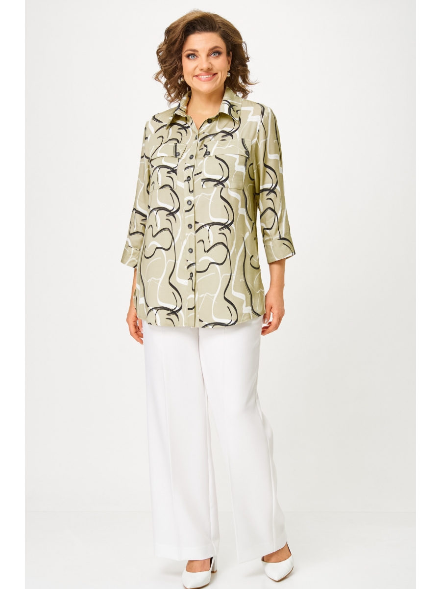 Блуза женская, прямого силуэта из текстильной ткани. Воротник отложной, застежка центральная на петли-пуговицы. По переду нагрудные вытачки и настрочены накладные карманы. Спинка цельная. Рукав втачной, одношовный, 3/4, с притачной манжетой. В боковых швах по низу небольшие разрезы.