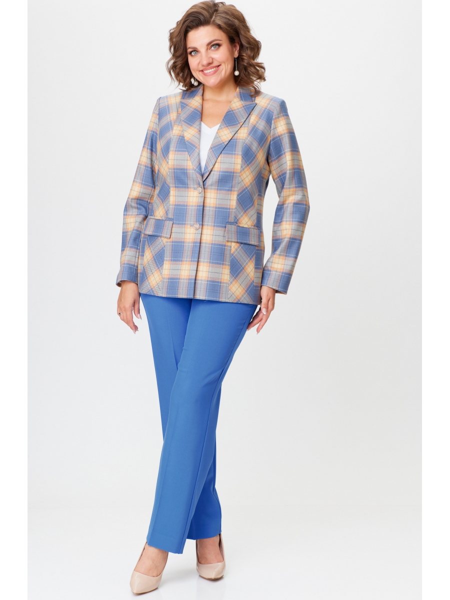 Жакет удлиненный, полуприлегающего силуэта с центральной бортовой застежкой на пуговицы до линии перегиба лацкана. Спереди рельефные швы от плечевого шва, отрезной бочок и карман с клапаном. Спинка с рельефами от плечевого шва. Рукав втачной, двухшовный. Воротник пиджачного типа. Жакет на подкладке.