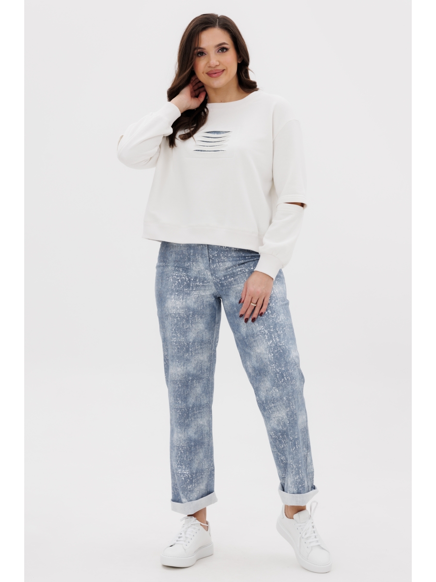 Свитшот свободного силуэта, с заниженной линией плеча, рукавом, расширенным в области оката, дизайнерской вставкой на полочке. Рукав двухшовный с поперечным подрезом на передней части.