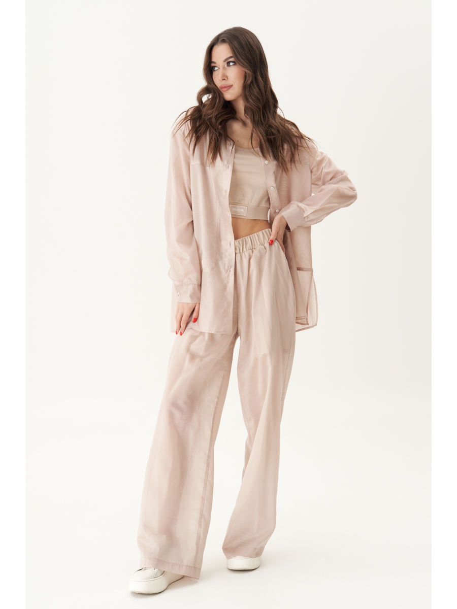 Свободная, невесомая рубашка, майка-топ и прозрачные брюки с эластичными шортами внутри. Рубашка оверсайз-силуэта, рубашечного покроя с центральной застёжкой, рубашечным воротником со стойкой и рубашечным рукавом на притачной на притачной манжете. Полочка с декоративным подрезом и двухслойной вставкой. Спинка с отрезной кокеткой и мягкой складкой. По боковым швам - разрезы.