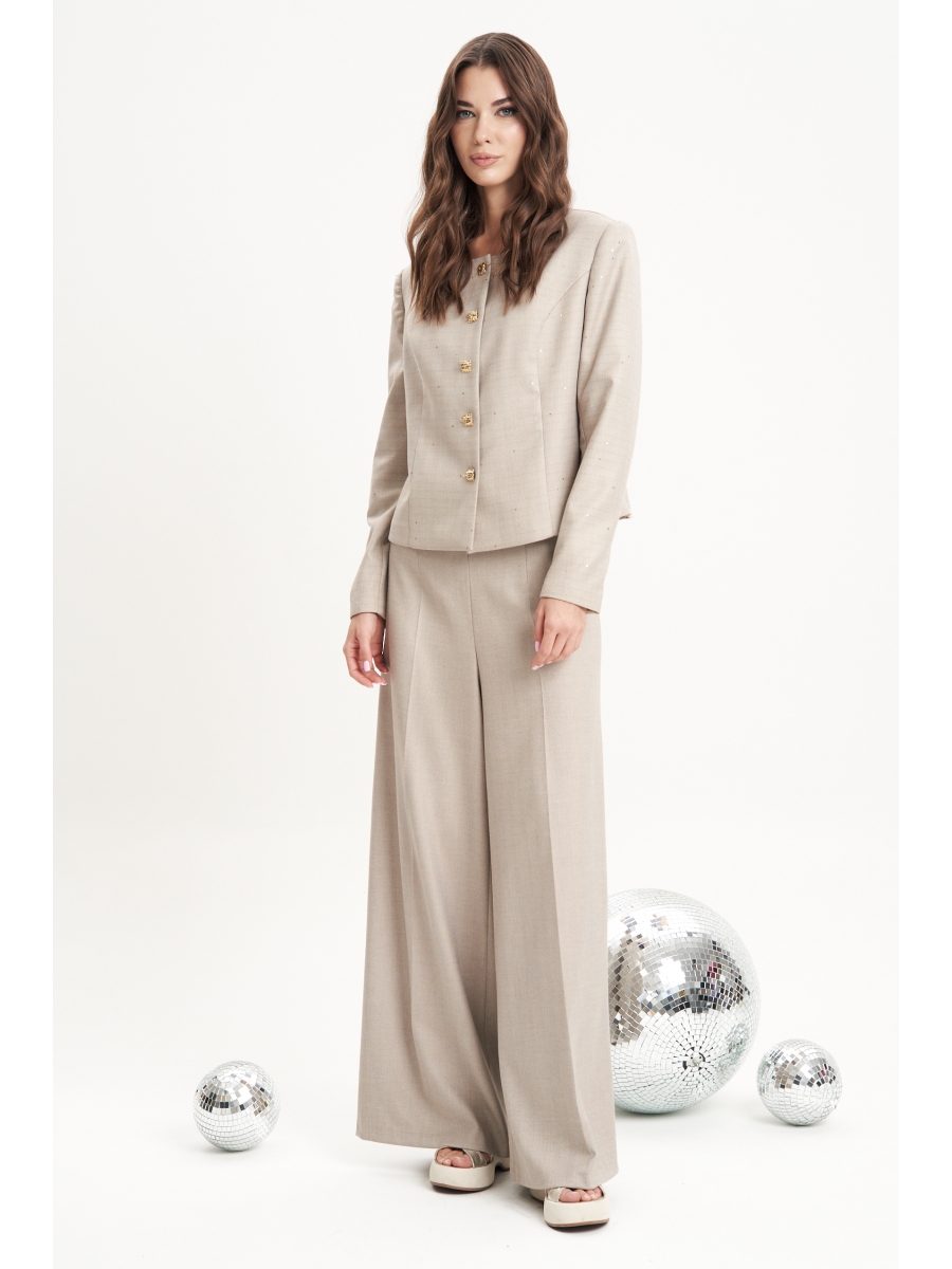 Жакет из необычного по текстуре материала с вкраплением пайетки, брюки из полотна без пайетки. Полуприлегающий силуэт пиджака с центральной застёжкой, круглым вырезом горловины и втачным покроем. Полочка с фигурным рельефом, спинка с фигурным рельефом, центральным швом и плечевыми вытачками. Рукав двухшовный.