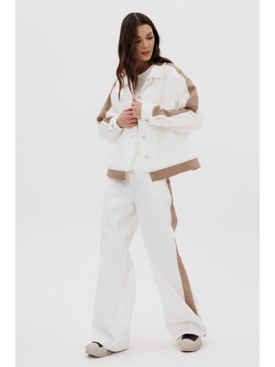 Свободный силуэт, рубашечный покрой, втачной воротник, рукав с притачной манжетой. Полочка с отрезной кокеткой, рельефами и карманом с клапаном. Спинка с отрезной кокеткой и рельефами. Рукав с локтевым швом и разрезом в нём, отделочным лампасом по центру рукава из контрастного денима, мягкой складкой и притачной манжетой. По низу куртки - притачная отделочная полоса в цвет лампаса. Застёжка центральная на петли и пуговицы.