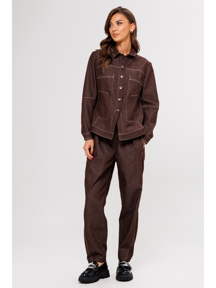 Жакет-рубашка полуприлегающего силуэта, втачного покроя с центральной фигурной застежкой на отрезной планке, втачным двухшовным рукавом на манжете и притачном поясом по низу, создающим слегка расширенную линию, имитирующую легкую баску. Полочка с отрезной кокеткой, вертикальным рельефом и фигурным накладным карманом нестандартной формы. Спинка с отрезной кокеткой и вертикальными рельефами.