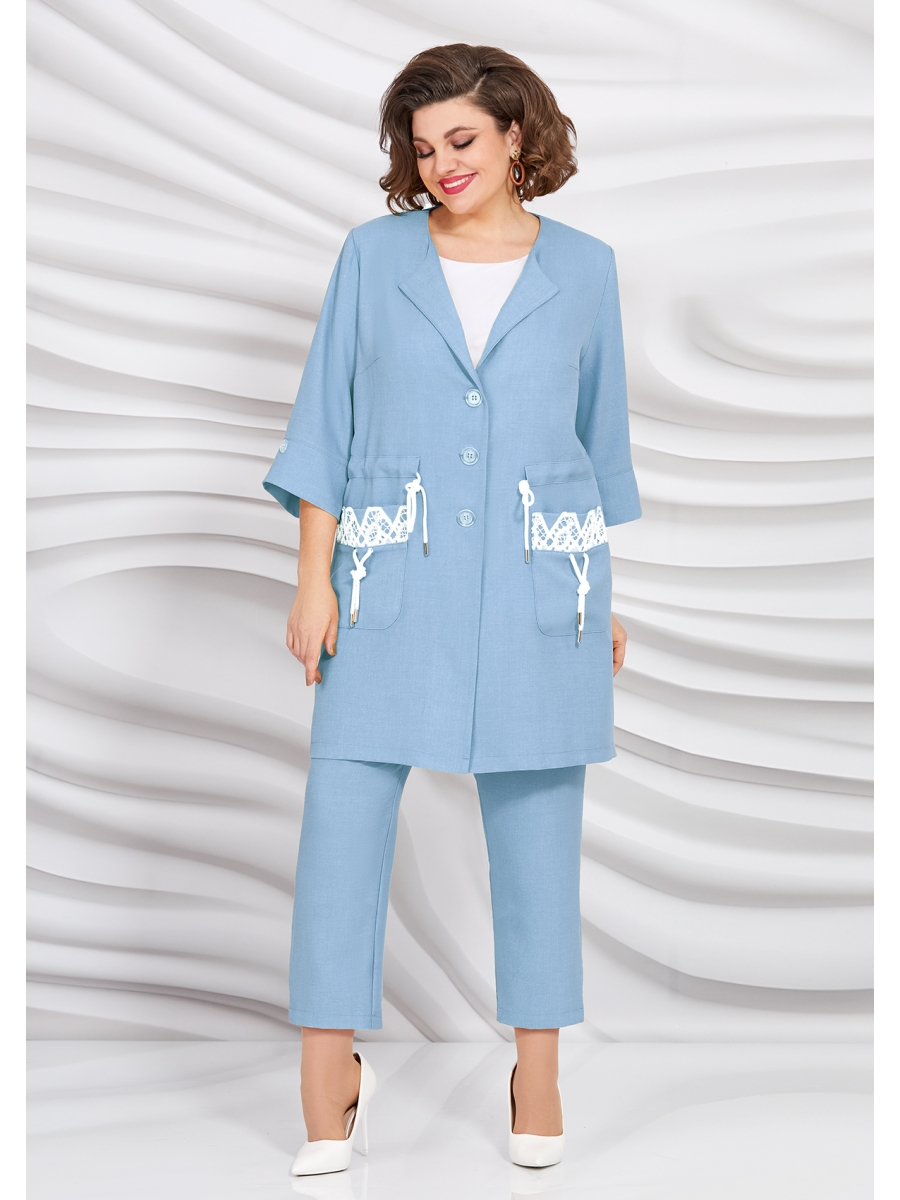Женский комплект, состоит из жакета, брюк и майки. Жакет свободного покроя, выполнен из льна-вишера, легкой летней ткани. Горловина округлой формы, на обтачке, застежка однобортная на петли-пуговицы. По линии талии настрочена кулиса из основной ткани с шнурком, также на полочке обработаны накладные карманы, декорированные кружевом и шнурками. Рукав втачной, оптимальной длины, с широкой манжетой по низу. Спинка выполнена из основной ткани с кулисой по линии талии, в боковых швах разрезы. Брюки прямого покроя, верхний срез обработан притачным поясом с резинкой по бокам, также выполнена застежка на тесьму-молнию. Также в боковых швах обработаны карманы, по низу брюк в боковых швах разрезы. Майка выполнена из хлопкового трикотажа, контрастного цвета, горловина округлой формы, по лифу выполнен декор из тесьмы в цвет основной ткани. Рукав майки укороченный, втачной. Стильный комплект из легкой, яркой ткани прекрасный выбор на любой день!