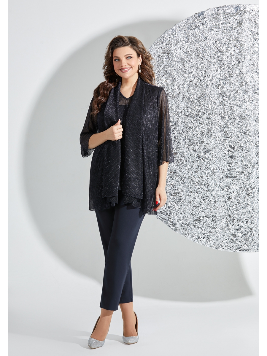 Верхняя блуза выполнена из плиссированной ткани, по горловине воротник шаль. Рукав втачной, расклешенный к низу, оптимальной длины.