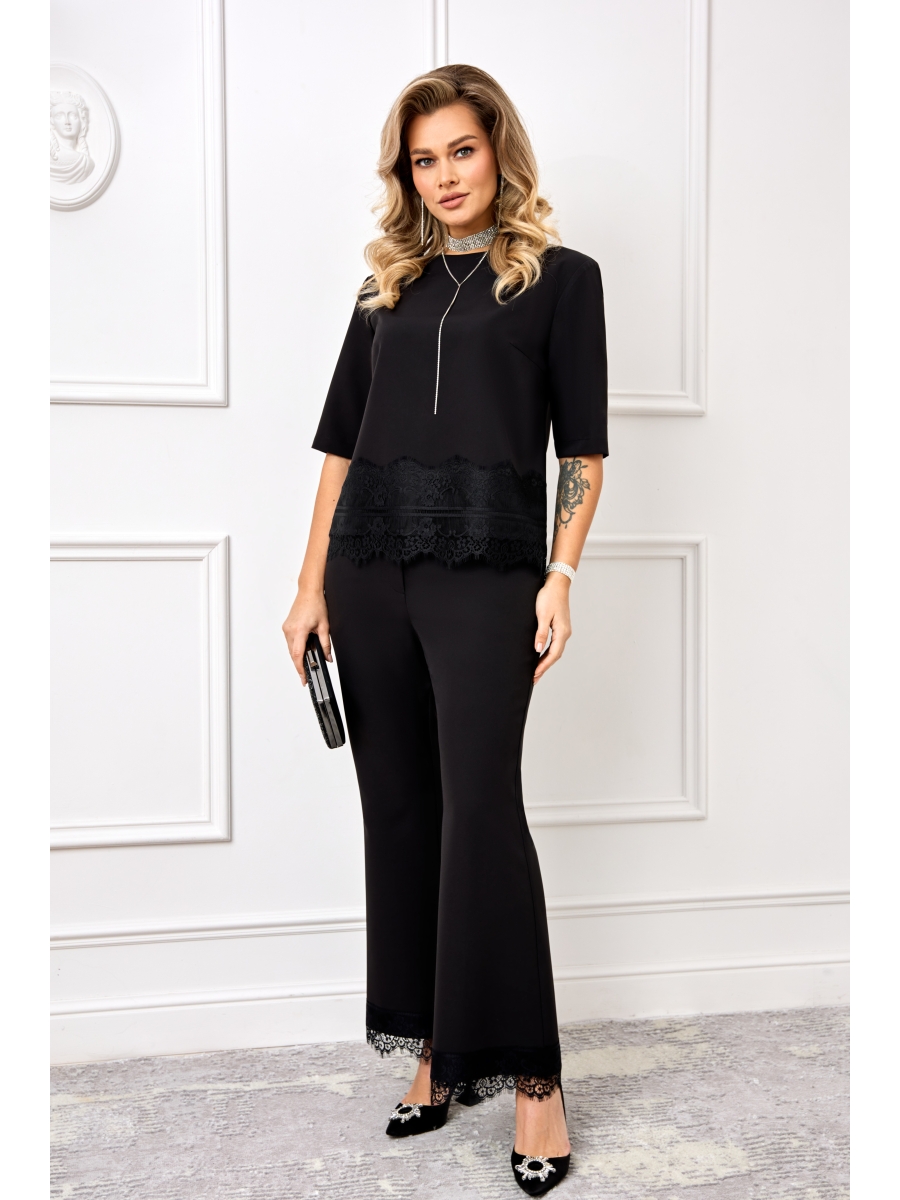 Брюки на поясе, по спинке с резинкой, спереди с застежкой на молнию и пуговицу. Брюки модного в этом сезоне силуэта, слегка заужены в области колена и расклешены к низу. Низ брюк декорирован французским кружевом.