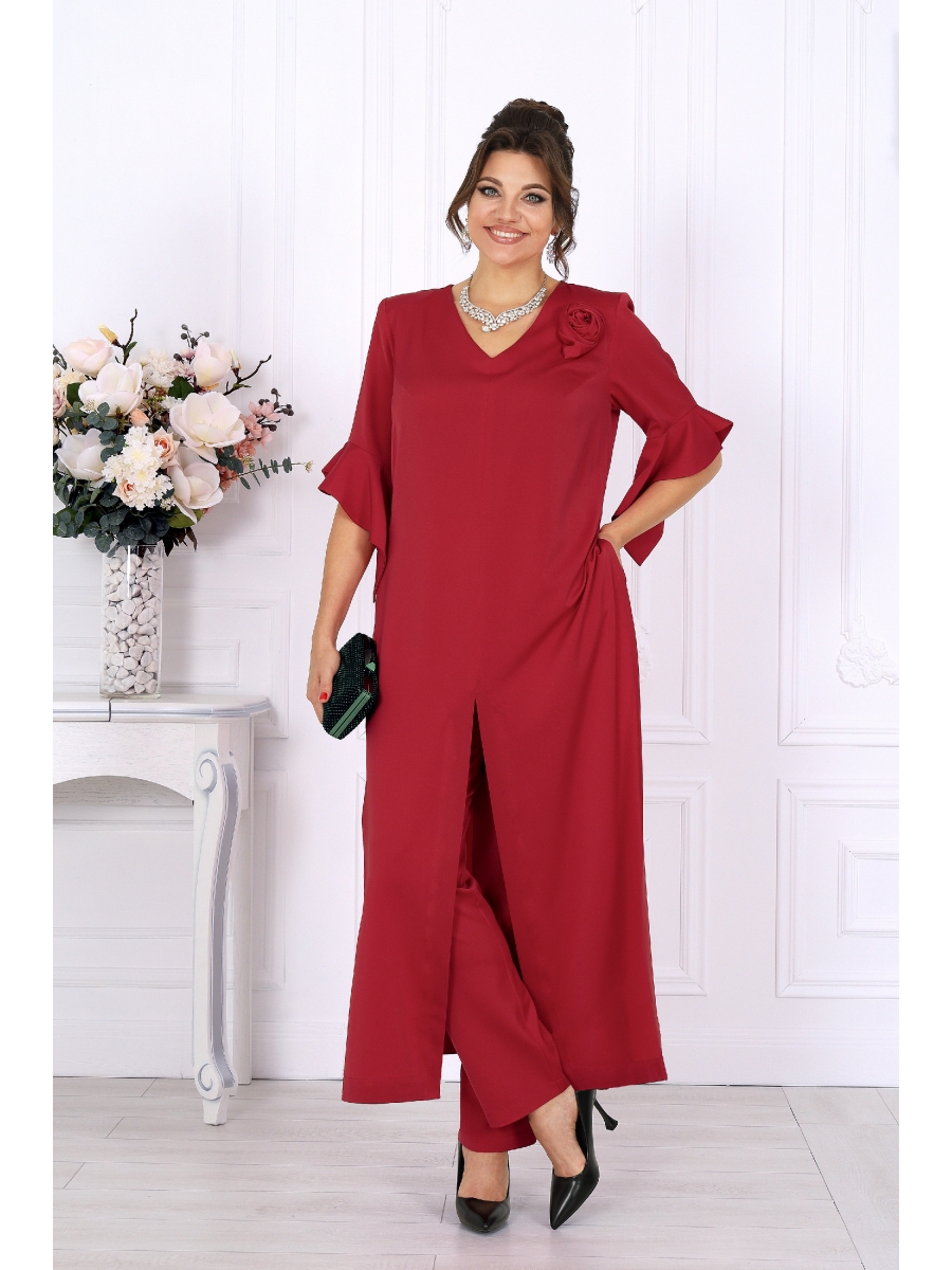 Туника полуприлегающего силуэта, выполнена из костюмно-плательного сатина. Модель без подкладки, с плечевыми накладками. Перед с нагрудными вытачками, направленными от пройм, и средним швом, в нижней части которого обработан разрез. Спинка с талиевыми вытачками и средним швом, в верхней части которого расположена застежка на потайную тесьму-«молнию», в нижней части-разрез. Ширина отделочной строчки по центральным разрезам переда и спинки – 4 см. В боковых швах высокие разрезы расположены от уровня талии до низа. Ширина отделочной строчки по боковым разрезам – 1 см. V-образный вырез горловины переда переходит в округлый по спинке. Рукав втачной, с асимметричным обтачным воланом по низу. Туника дополняется съемным декоративным цветком «роза», выполненным из основной ткани. Длина туники – 133,5 см (46-52 р-р), 135 см (54-62 р-р).