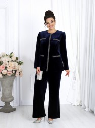 Премиальный костюм, выполненный в роскошном велюре, сочетает классический крой и стильные детали, создавая элегантный образ для делового, офисного или праздничного гардероба. Жакет полуприлегающего силуэта с безупречными линиями рельефных швов подчеркивает фигуру, а декоративная тесьма со стразами добавляет нотку утонченности в стиле Шанель. Застежка на пуговицы скрыта для минималистичного эффекта, а имитация карманов и прорезные карманы придают жакету современный и стильный вид.