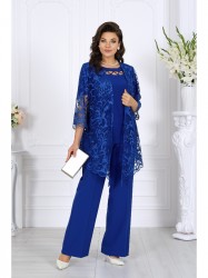 Комплект состоит из трёх предметов: изысканного кардигана из гипюра, мягкой трикотажной блузки и классических брюк со стрелками. Такой ансамбль выглядит нарядно, подчеркивает женственность и формирует правильный силуэт даже для фигур plus size.