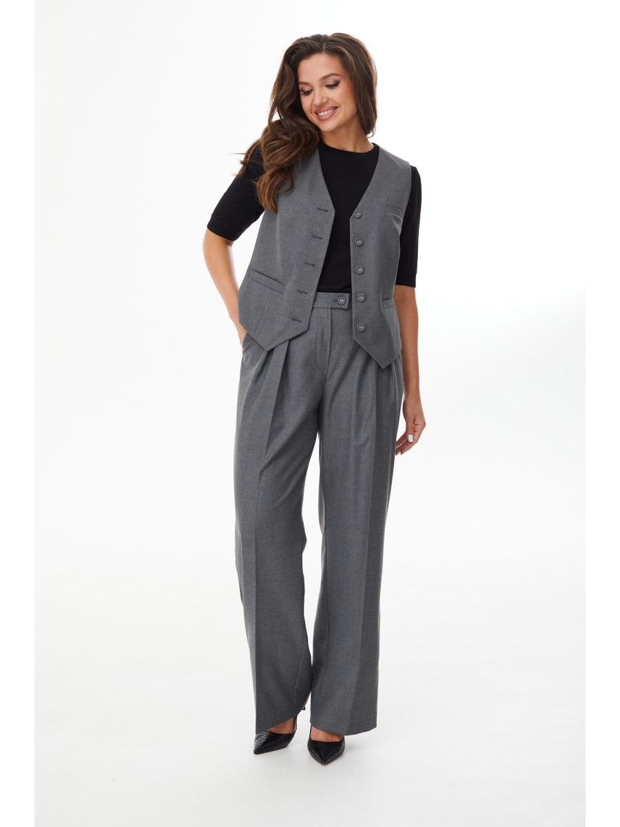 Брюки свободного силуэта с косыми карманами. Пояс брюк прямой, из пояса по переду с каждой стороны от гульфика по две складки. Застежка на пуговицы и молнию.