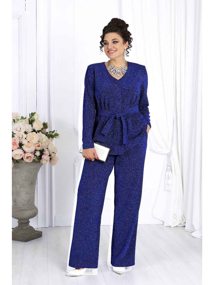 Элегантный брючный комплект – идеальный выбор для праздника, вечера в ресторане или важного мероприятия. Жакет с выразительным V-образным вырезом и аккуратными складками по линии талии подчёркивает женственный силуэт, а сияющая ткань с люрексом придаёт образу динамику и мягкость, создавая гармоничное сочетание классики и современности.