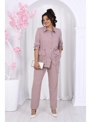 Жакет прямого силуэта, выполнен из ткани «лен-вишер». Модель без подкладки, с плечевыми накладками и однобортной внешней застежкой с отрезными планками на 7 петель и 7 пуговиц. Перед с нагрудными вытачками, выходящими из пройм. В нижней части переда настрочены накладные карманы с бантовой складкой посередине кармана и клапаны, застегивающиеся на 1 петлю и 1 пуговицу. По спинке и частично по переду настрочена кулиса, в которую втянут поясок из основной ткани. Для регулировки сборки по кулисе предусмотрены фиксаторы, концы пояса оформлены наконечниками. Горловина округлой формы со стояче-отложным воротником на отрезной стойке. Рукав втачной, длинный, с притачной манжетой, застегивающейся на 1 петлю и 1 пуговицу; по середине рукава настрочена пата, застегивающаяся на 1 петлю и 1 пуговицу, что позволяет регулировать длину рукава. Длина жакета - 71 см (46-50 р-р), 72 см (52-60 р-р), 73 см (62-66 р-р). Длина рукава (с манжетой) - 61 см.