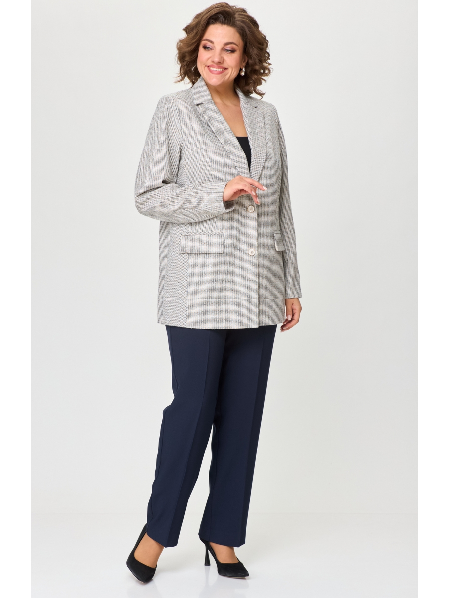 Жакет удлиненный, из рогожки, полуприлегающего силуэта с центральной бортовой застежкой на пуговицы до линии перегиба лацкана. По переду имеется отрезной бочок и вертикальные вытачки. С прорезными карманами с клапаном и двумя обтачками. Спинка цельная. Воротник пиджачного типа. Рукав двухшовный, втачной. Жакет на подкладке.