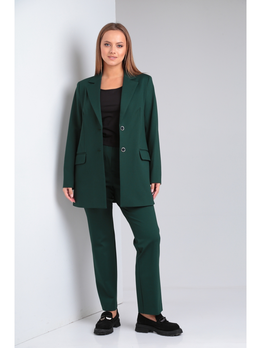 Жакет свободного покроя на подкладке. По переду центральная застежка на петли-пуговицы, ппрорезные карманы в рамку с клапаном, отрезной бочок, переходящий на спинку. По спинке средний шов с высоким разрезом от линии талии и декоративным хлястиком. Воротник с лацканом, пиджачного типа. Рукав втачной длинный двухшовный с отлетной шлицей по локтевому шву.