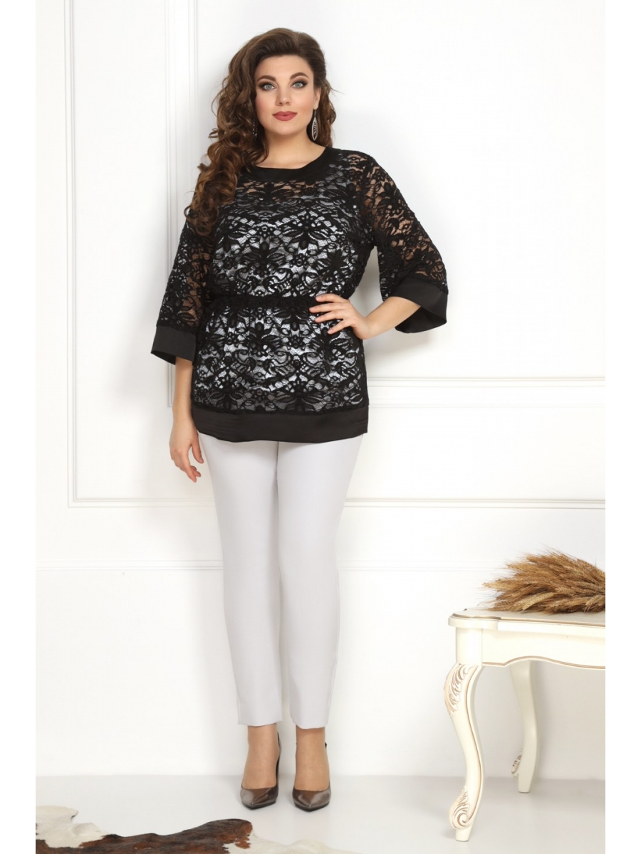 Комплект для женщин молодого и среднего возраста. Данное изделие состоит из трех вещей: брюки, топ и гипюровая блуза. Брюки заужены к низу, на широком поясе, по переду карманы, застёжка- молния и пуговицы.