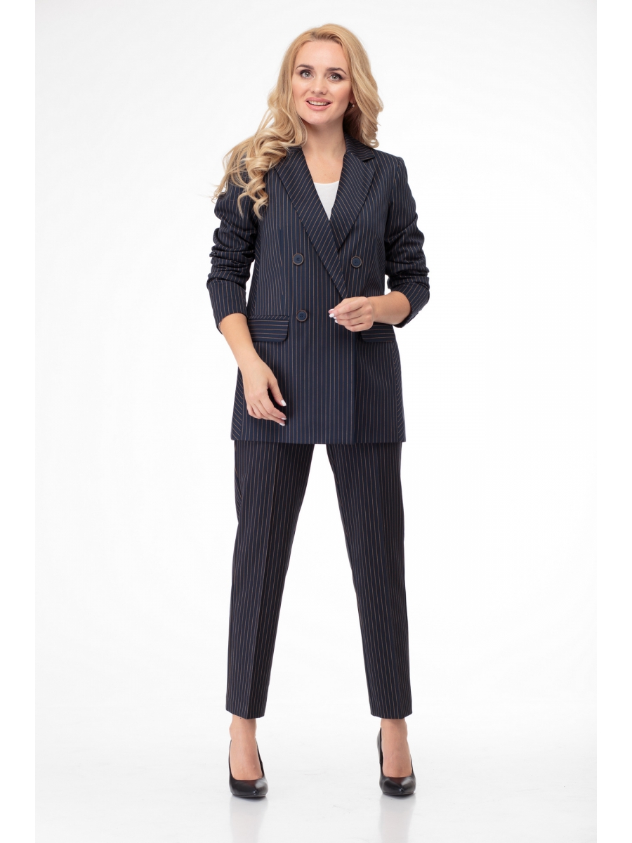 Оформить заказ →Комплект 2-х предметный состоит из жакета и и брюк. Двубортный жакет, свободного кроя, на подкладке. По переду имеется отрезной бочок и вертикальные вытачки. С прорезными карманами с клапаном и двумя обтачками. Спинка цельная. Воротник пиджачного типа. Рукав двухшовный, по низу рукава обработана шлица на петли-пуговицы. Длина рукава 63 см, длина по спинке 74 см. Классические брюки, прямые, слегка заужены к низу,заутюжены стрелки, по переду обработаны карманы с отрезным бочком, застежка на тесьму-молнию и 1 пуговицу.На задних половинках обработаны вытачки и имитация карманов с листочкой, пояс в брюках притачной, без резинки. Длина брюк от талии по боковому шву 100 см.
