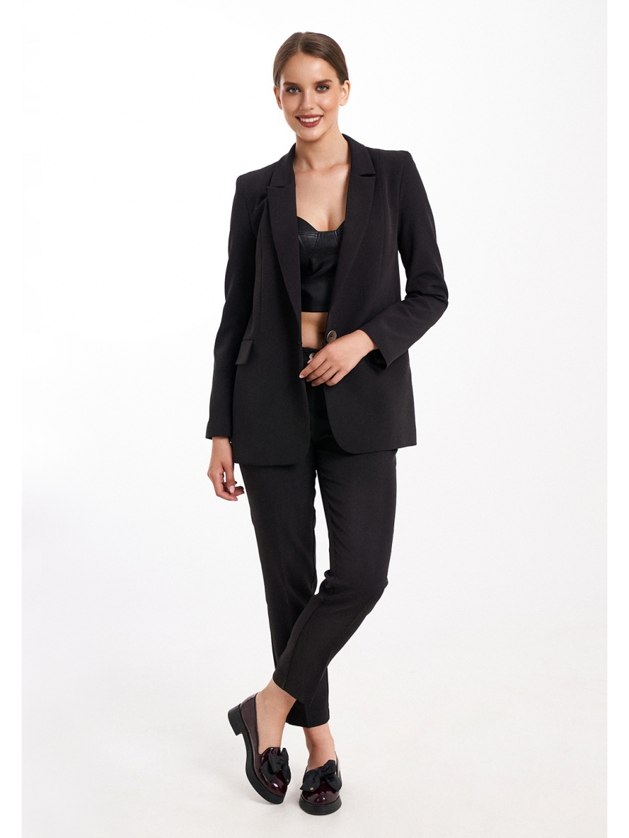 Универсальный женский жакет на подкладке прямого силуэта. Перед с центральной застежкой на одну пуговицу, с карманами и с клапанами в шве. Воротник стояче-отложной втачной с отворотом лацкана. Рукав двухшовный, втачной.