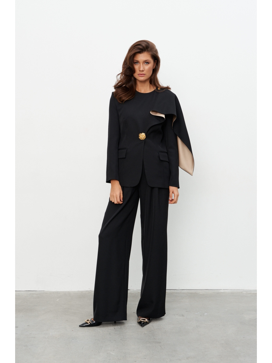 Комплект состоящий из жакета и брюк выполненных из струящейся ткани.