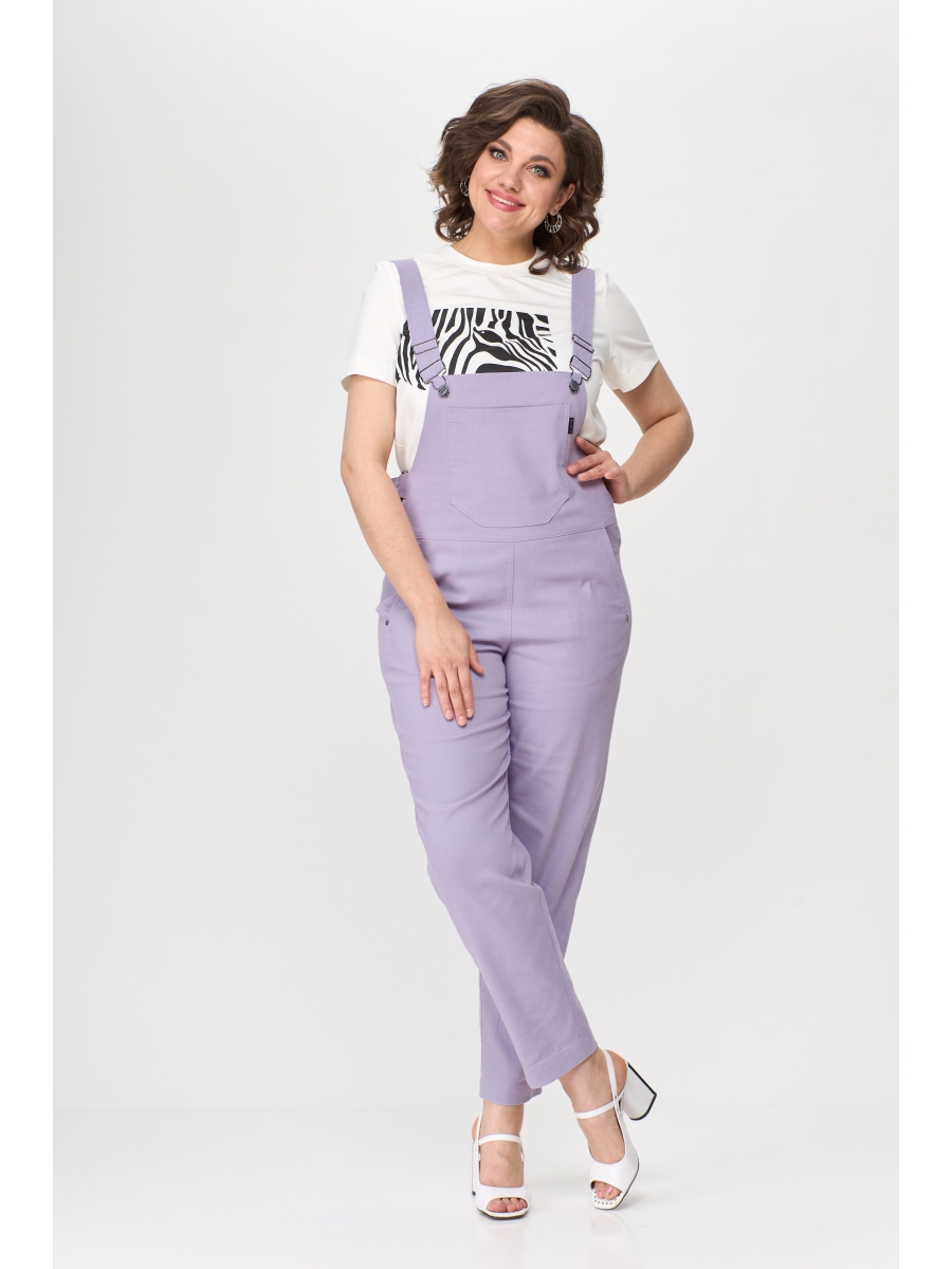 Комбинезон выполнен в спортивном стиле, отрезной по линии талии, с бретелями застегивающими на металлическую застежку. По переду на груди накладной карман. По брюкам в боковых швах лампасы, по переду в боковых швах брюк на уровне бедер карманы. На задних половинках накладные карманы.