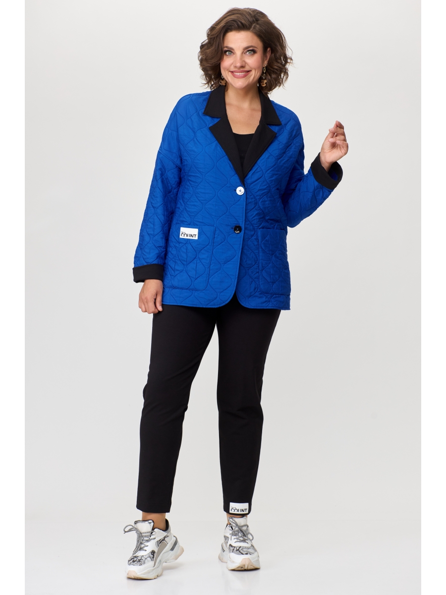 Жакет выполнен из стеганой ткани, дизайн «луковичка». Жакет свободного силуэта с центральной застежкой на петли-пуговицы. Воротник пиджачного типа с отложным лацканом. На уровне бедер накладные карманы. Жакет со спущенной линией плеча. Рукава втачные с отложным манжетом по низу. Воротник, лацкан и манжет выполнены из отделочной ткани. Жакет без подкладки.