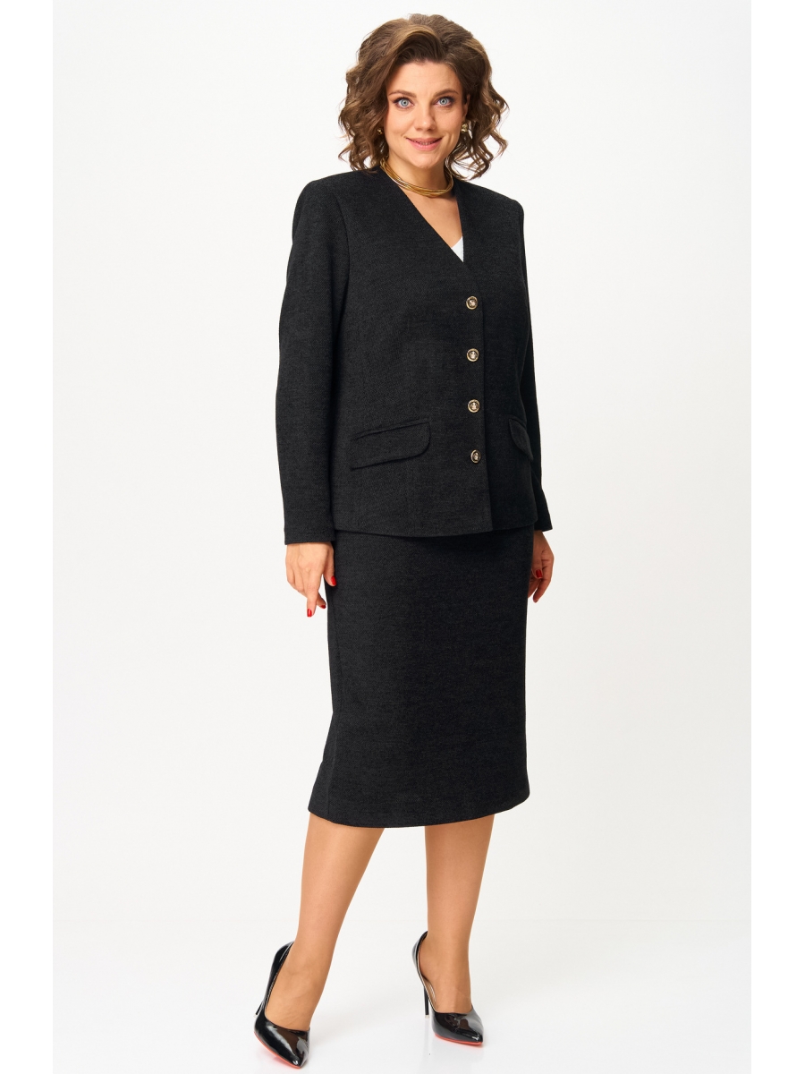 Юбка прямого силуэта, удлиненная, верхний срез юбки обработан обтачкой, имеются талиевые вытачки, заднее полотнище со средним швом, застегивается на потайную молнию. Шов переходит к низу в шлицу. Юбка на подкладке.