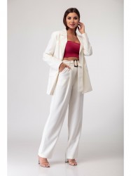 В комплект входит: двубортный жакет прямого силуэта, умеренно широкие прямые брюки со складками впереди и притачным поясом с высокой посадкой, боковыми действующими карманами.
