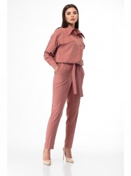 Блузон прямого силуэта, однобортный с потайной застежкой на пуговицы, отлажным воротником на стойке. Низ на притачном поясе с эластичной тесьмой внутри. Накладные карманы с клапанами. Рукава рубашечного покроя с декоративным подрезом с отстрочкой. Низ рукава на притачном манжете. Блузон дополнен съёмным завязывающимся поясом.