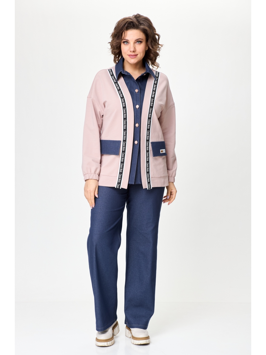 Жакет выполнен из двух видов ткани, джинса и футера, в виде имитации рубашки с кардиганом. Жакет с центральной застежкой на пуговицы, горловина с рубашечным воротником на стойке, по переду отделка тесьмой, в нижней части накладные карманы с клапаном. Рукава втачные со спущенной проймой, по низу на резинке.