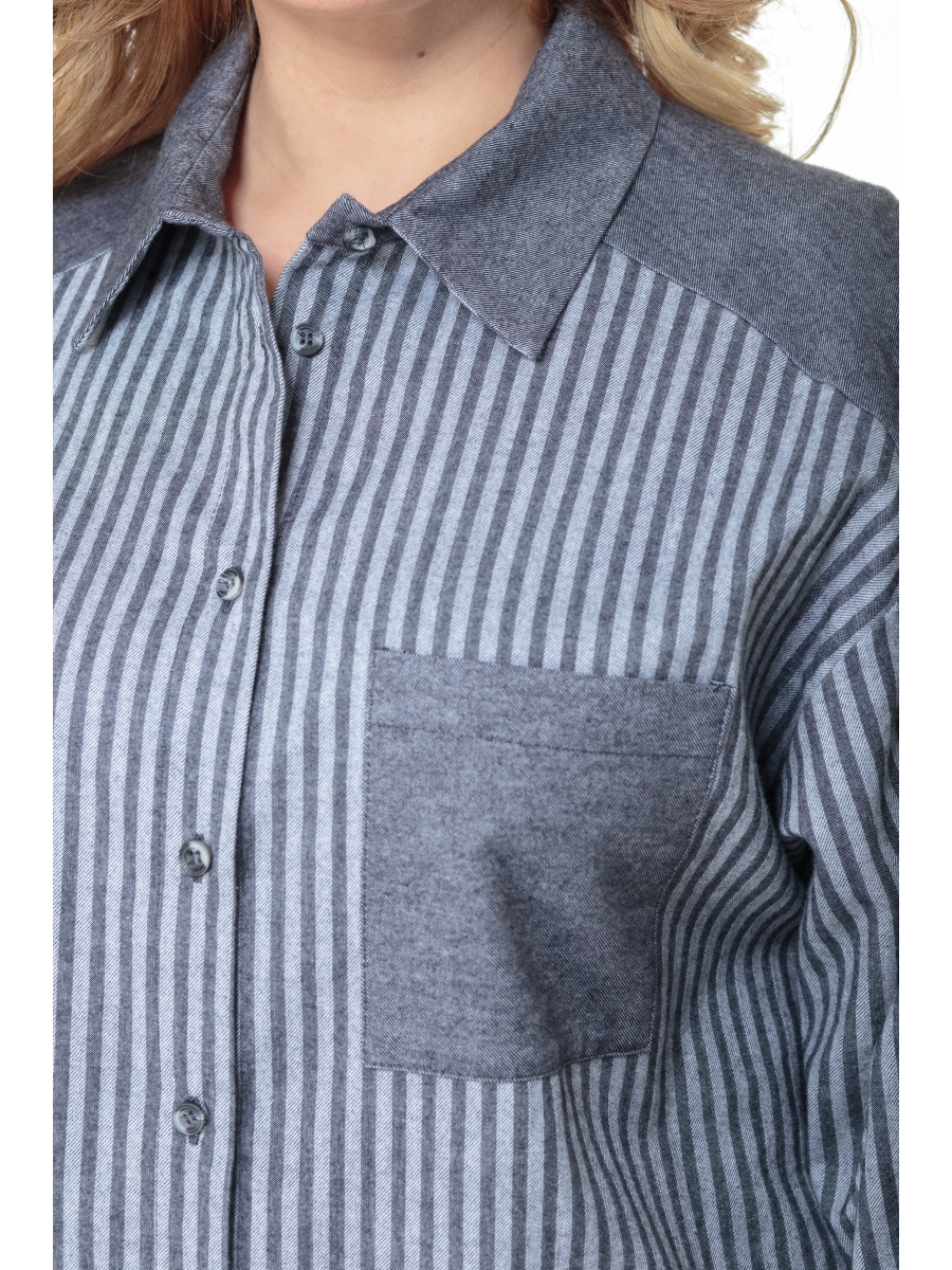 Кокетка, накладной карман, воротник на стойке и манжеты выполнены из однотонного полотна. Низ блузы ассиметричный.