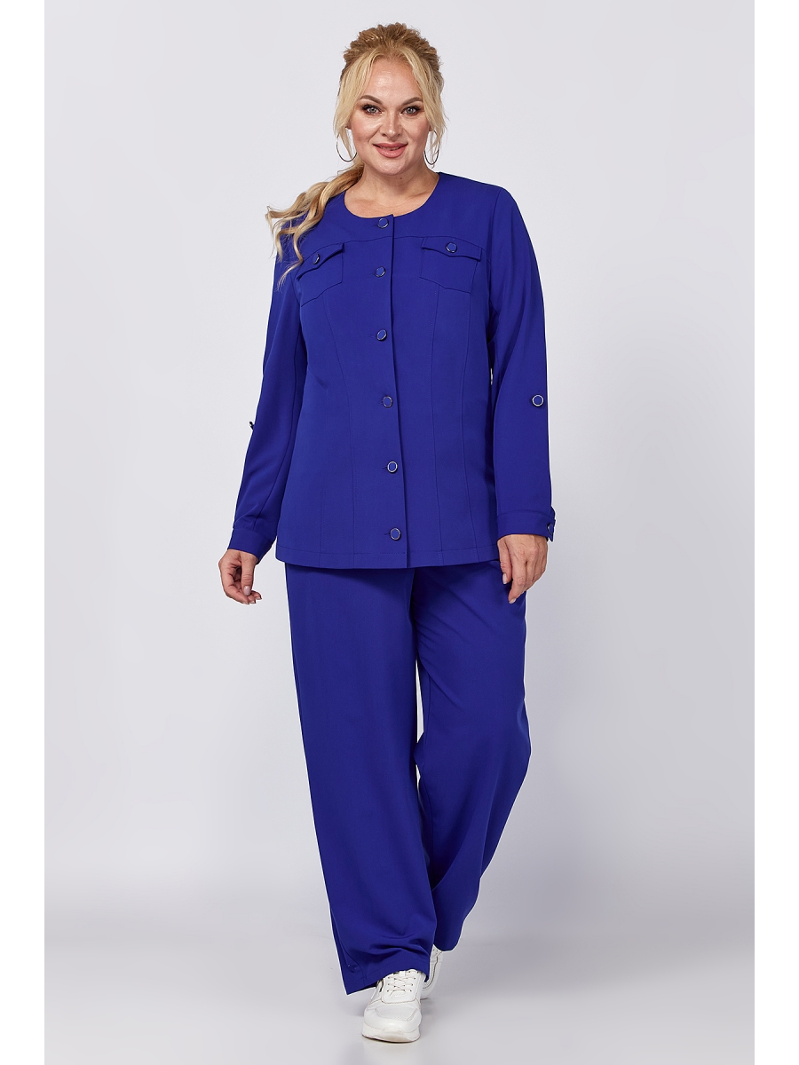 Стильный двух предметный  костюм для женщин из костюмной  ткани «гальяно» - это идеальное сочетание комфорта и элегантности. Такой  костюм подходит как для офисного делового образа, так и для повседневного ношения. Жакет костюма выполнен в классическом стиле на пуговицах, без воротника с накладными карманами. Рукав длинный на манжете с патой на петлю и пуговицу. По боковым швам обработаны разрезы. Брюки костюма имеют прямой крой в стиле палаццо, что позволяет создать строгий и элегантный образ. Карманы на брюках расположены по бокам, что добавляет практичности и функциональности. Пояс брюк на резинке. Этот костюм не только обеспечит вам ощущение комфорта в любой ситуации, но также придаст изящности и женственности вашему образу. Если к костюму  добавить из Вашего  гардероба белую нарядную блузу-  получится нарядный комплект.