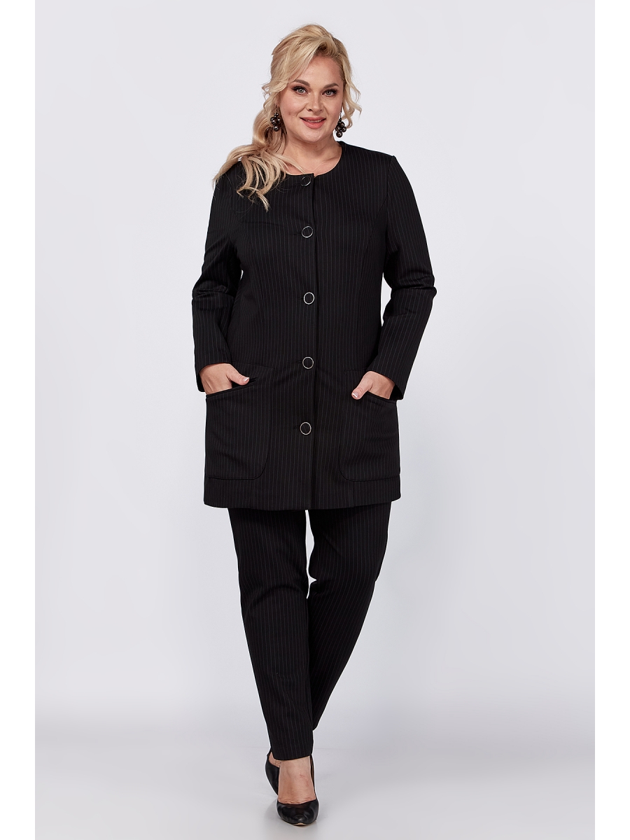 Комплект-двойка состоит из жакета и брюк. Трикотажная ткань в полоску с хорошим стрейч-эффектом добавит комфорт при носке изделия. Жакет удлинённый, полуприлегающего силуэта, без воротника. Спинка со средним швом. По переду жакета есть рельефные швы от пройм, большие накладные карманы, на которых расположены клапаны в рамку. Жакет без подкладки. Застёжка на петли и пуговицы. Рукав втачной, длинный, двухшовный. Удобные и комфортные брюки прямого силуэта со стрелками в этом комплекте - незаменимая в гардеробе вещь, которая подчеркнёт всю утончённость женской натуры и позволит всегда чувствовать себя комфортно. Перед с застёжкой на молнию и пуговицу, карманами-хулиганами. Пояс в области боковых швов дополнен эластичной тесьмой. Элегантная повседневная модель для города.