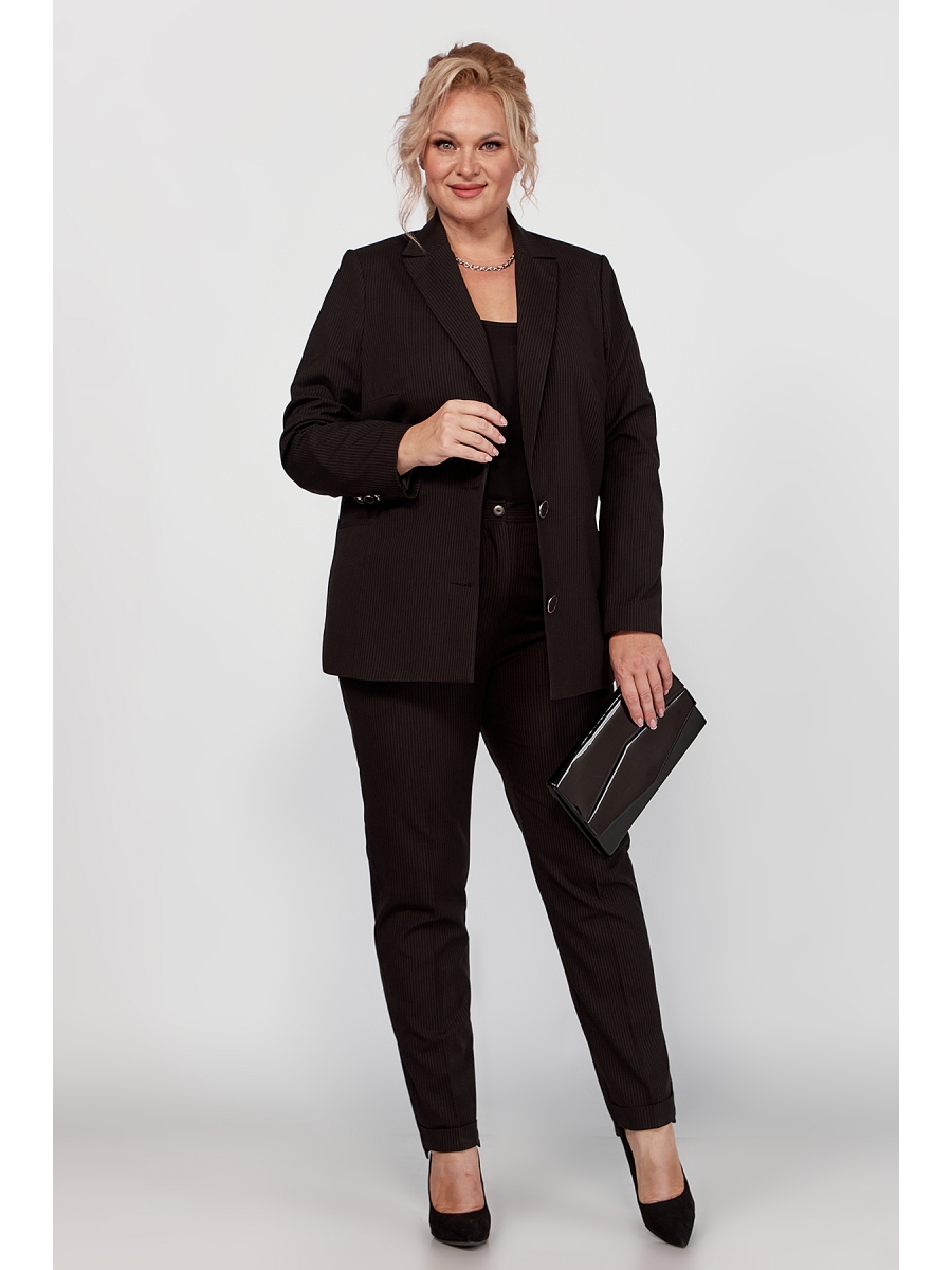 Брючный классический костюм в полоску помогает создать своей обладательнице шикарный образ в любое время года, будь то осень, весна или лето. Такая стильная вещь незаменима в повседневном базовом гардеробе современной модницы. Удлиненный жакет на подкладке с лацканами и воротником полуприталенного кроя имеет традиционную застежку на две пуговицы. На полочке обработаны функциональные прорезные карманы с листочкой. Брюки прямые, слегка зауженные книзу. В боковом шве выполнен карман-хулиган. На передней и задней половинке – вытачки. Верхний срез обработан притачным поясом, а в области боковых швов собран на эластичную тесьму. Линия низа брюк разноуровневая, передняя часть с притачной манжетой. Модель с гульфиком и застежкой на пуговицу и тесьму-молнию. Посадка высокая. Оригинальный современный костюм подарит комфорт женщинам и девушкам всех возрастов. Позвольте себе выглядеть красиво и носить модную, стильную одежду из костюмной ткани в полосочку. Сочетая костюм с различными вариантами блуз и маек из Вашего гардероба, можно создать как нарядный, так и повседневный образ.