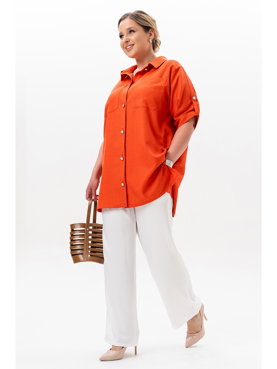 Женский брючный костюм - это всегда стильно! Элегантный дизайн костюма подарит комфорт и уверенность в себе. Летний брючный костюм в стиле сафари из костюмной ткани лен-твил. Жакет рубашечного кроя, свободного силуэта с кокеткой и встречной складкой по спинке, на полочках имеются 2 накладных кармана, воротник отложной, рукав втачной с патой длиной до локтя. В боковых швах есть разрезы. Брюки прямые, свободного кроя, высокой посадки, пояс на резинке. В боковых швах брюк есть карманы-хулиганы . Этот модный костюм-двойка больших размеров отлично подойдет на весну и лето для офиса, праздника, на каждый день, для вечеринки, для прогулок, для отдыха, для работы, для высоких и невысоких девушек и женщин, а также будущих мам. Костюм также поможет создать стильный и незабываемый  нарядный образ, став любимой вещью в гардеробе!