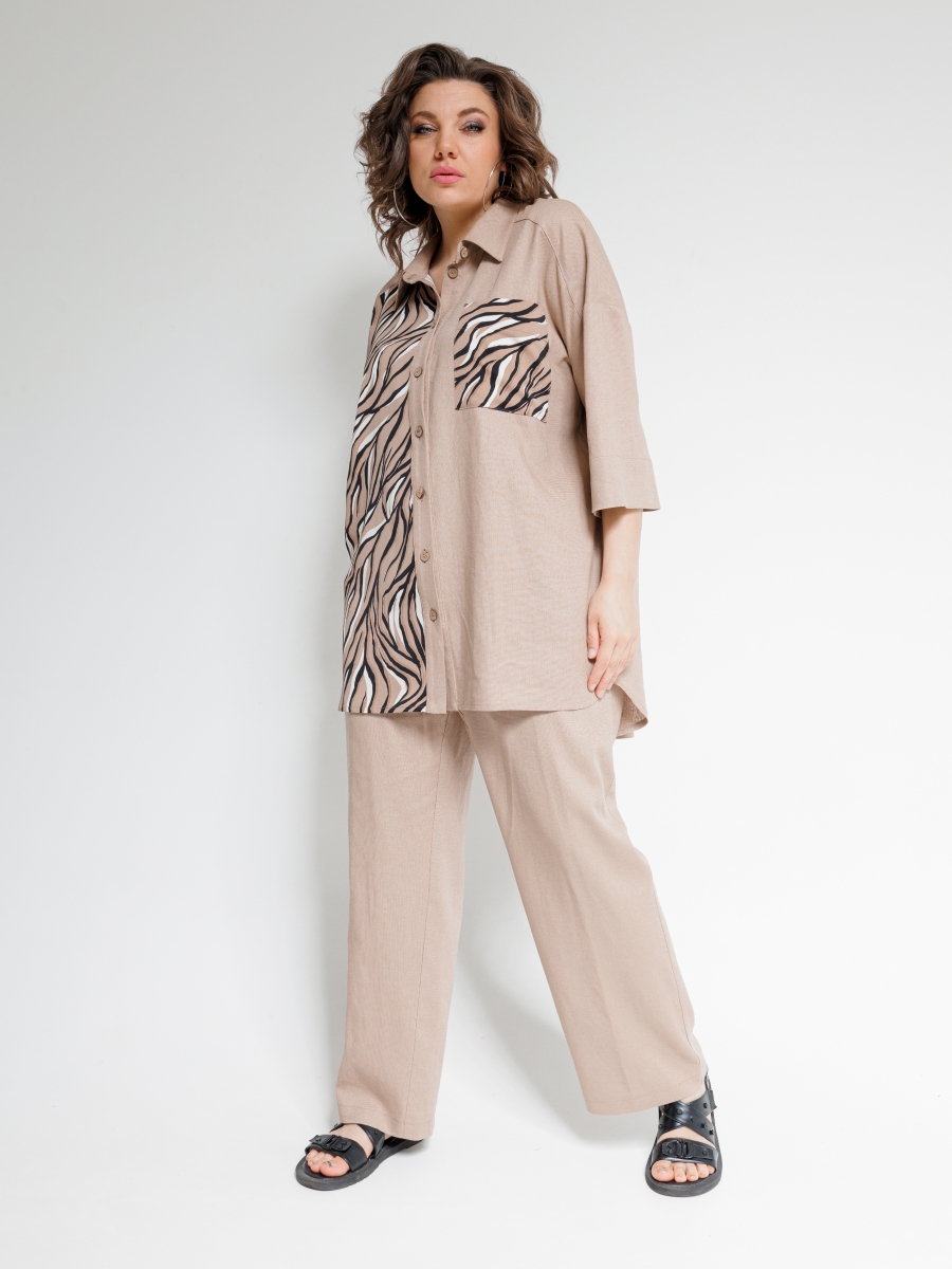 Стильный брючный льняной костюм состоит из блузки и брюк.