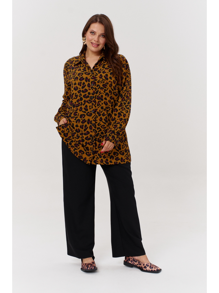 Блузка женская классическая - это универсальный предмет гардероба девушки. Блузка из стрейчевой ткани свободного силуэта. Воротник рубашечного типа. Рукав втачной, одношовный, внизу на манжете, с застежкой на петлю-пуговицу. Внизу по боковым швам обработаны разрезы. Полочка с центральной застежкой на петли-пуговицы. По спинке – кокетка. Такая блузка считается эталоном стиля. Трендовая блузка с рисунком «леопард» – это элемент одежды в любое время года и по любому случаю.