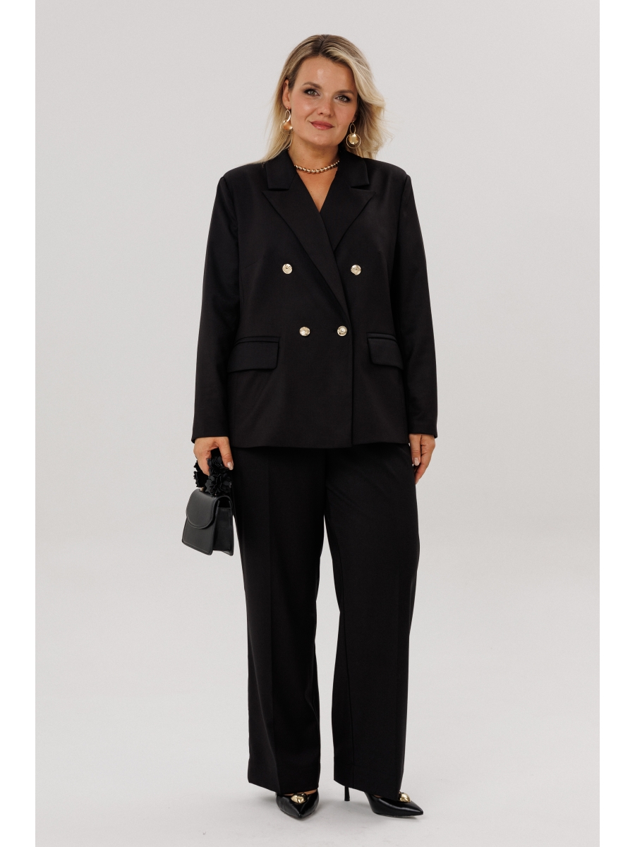 Классический приталенный двубортный жакет с пиджачным воротником на подкладке прямого кроя, имеет удобные функциональные карманы с клапанами, что добавляет практичности. Прекрасным решением в костюме являются позолоченные пуговицы на застежке и рукавах.