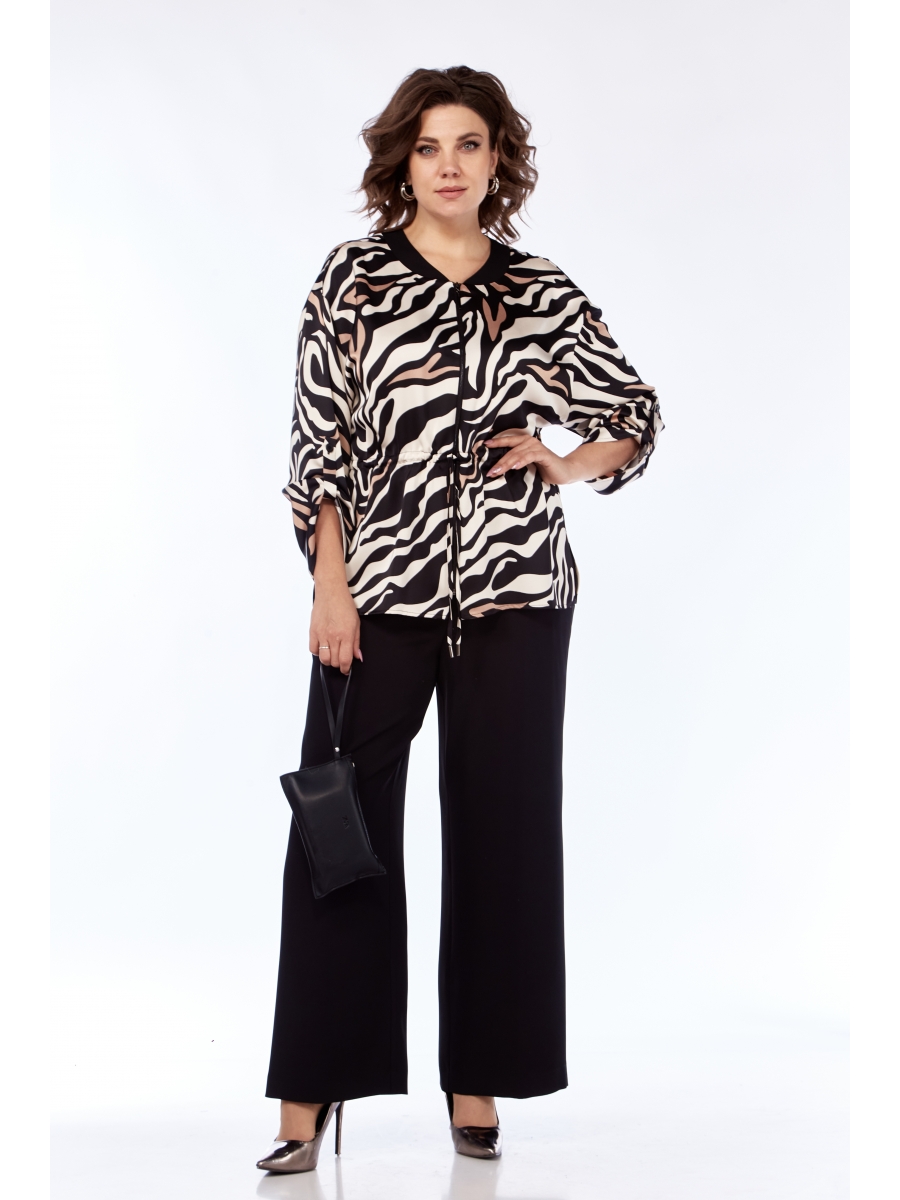 Брюки прямые. Пояс притачной, частично на резинке. Застежка классическая гульфик на молнию и пуговицу. Карманы в области боковых швов.